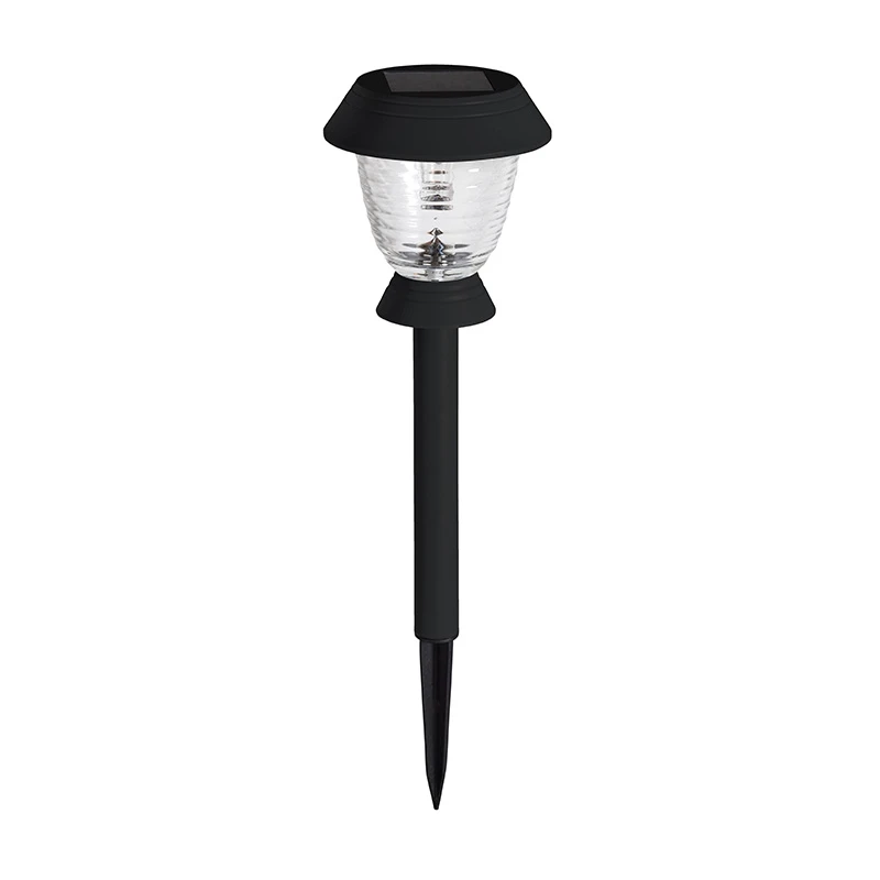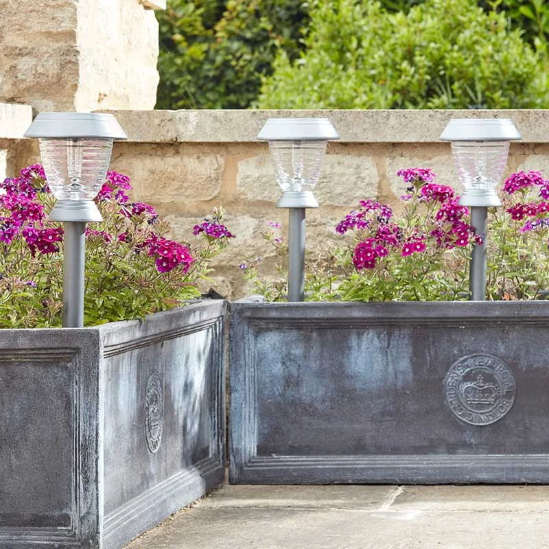 - Set of 4 solar LED super bright stake lights in a dark grey finish with clear ribbed diffusers