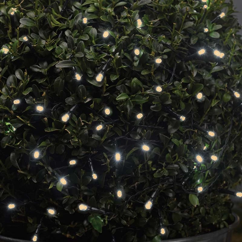 - Battery operated string light set on a black cable with 400 warm white LEDs and 8 multi-function options