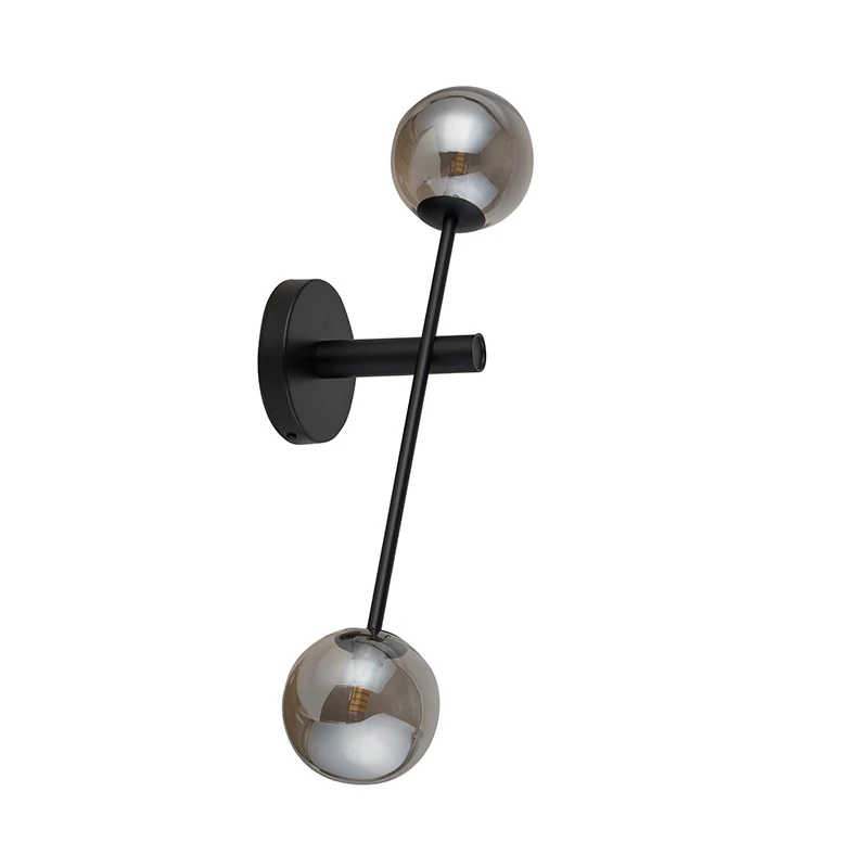 - Modern twin wall light in a black finish with smoked glass diffusers