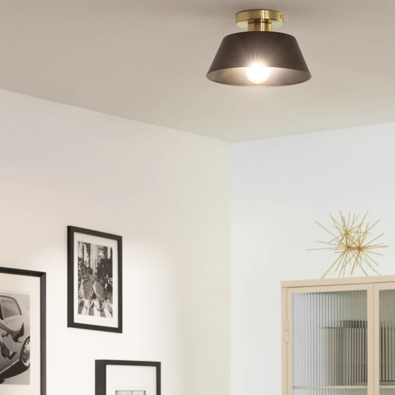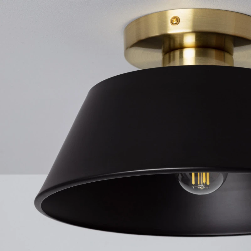 - Semi-flush ceiling light with brass ceiling rose and black tapered metal shade