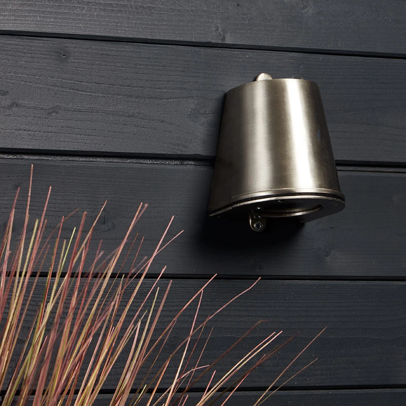 - Solid brass outdoor wall light in a in a raw textured matt nickel finish with clear glass diffuser providing down lighting