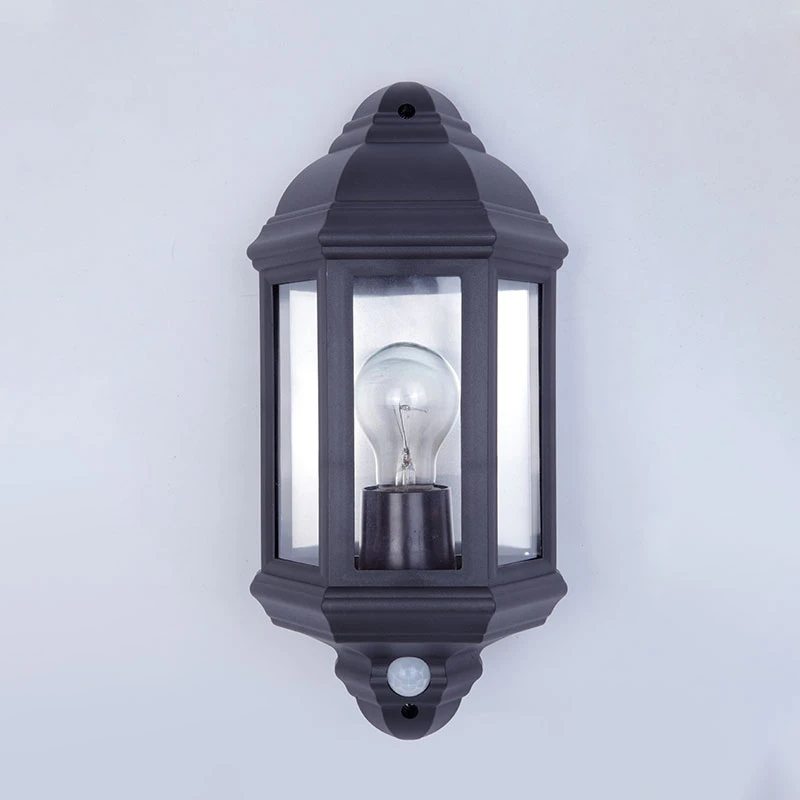 - Outdoor polycarbonate coastal PIR wall light in a black finish with 3 clear panes