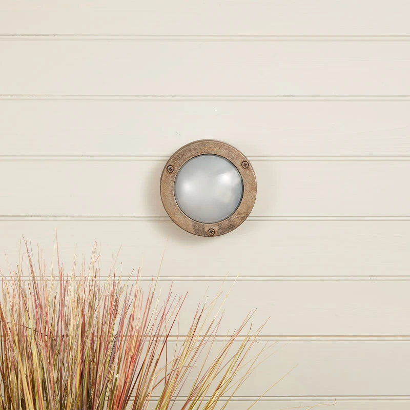 - Solid brass oval bulkhead in a raw textured, natural pewter finish with frosted glass diffuser