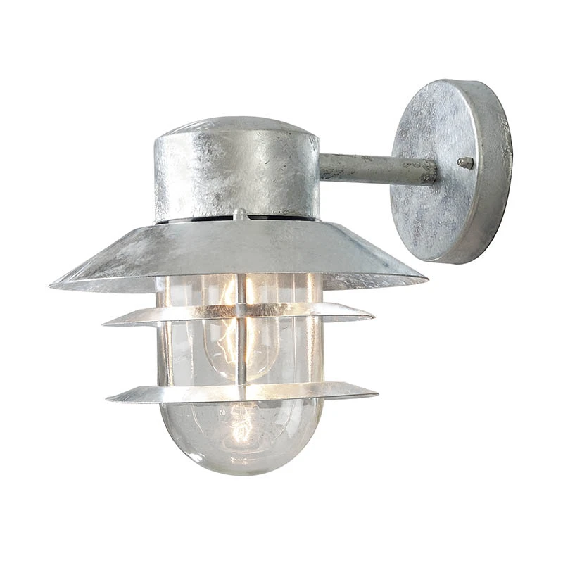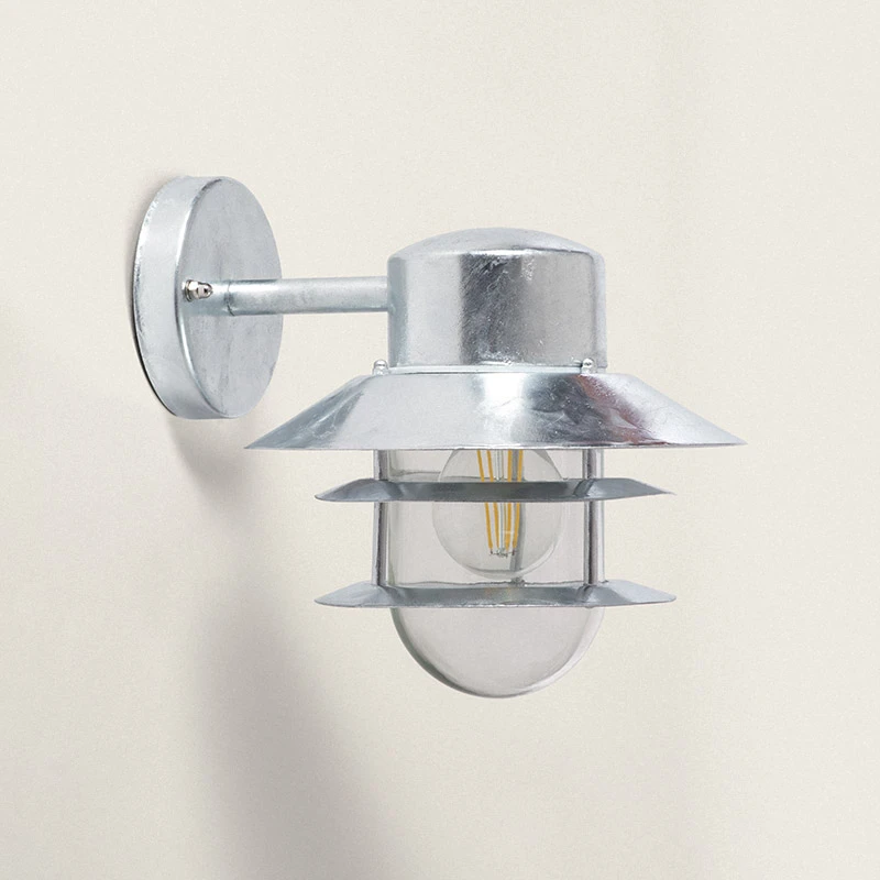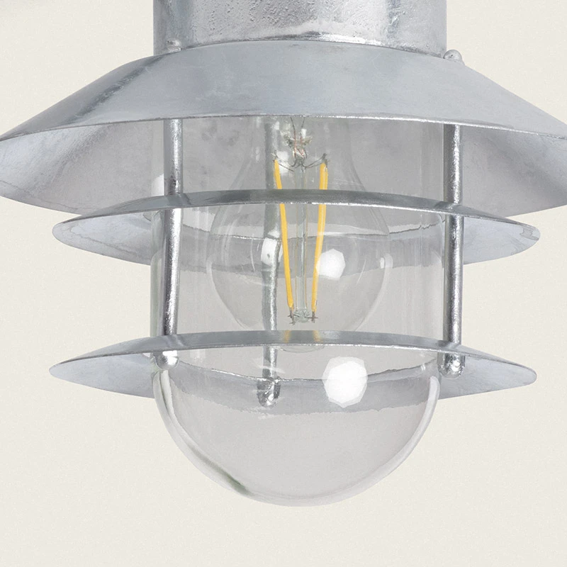 - Outdoor coastal resistant hanging wall light in a natural raw galvanised steel finish with a three tiered cage guard surrounding the clear glass diffuser