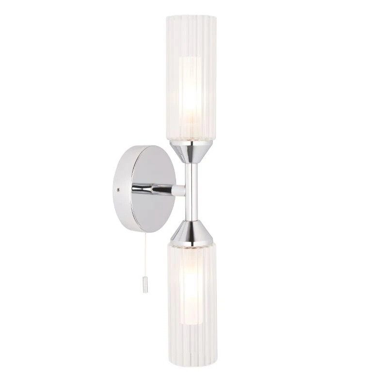 - Bathroom wall light in a polished chrome finish with flute clear clear glass fluted shades, frosted diffusers and on/off pull cord