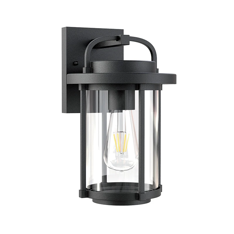 - Aluminium outdoor lantern wall light in a black finish with clear acrylic panes