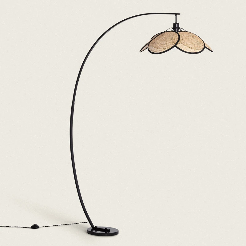 - Single light floor lamp in a black, natural finish