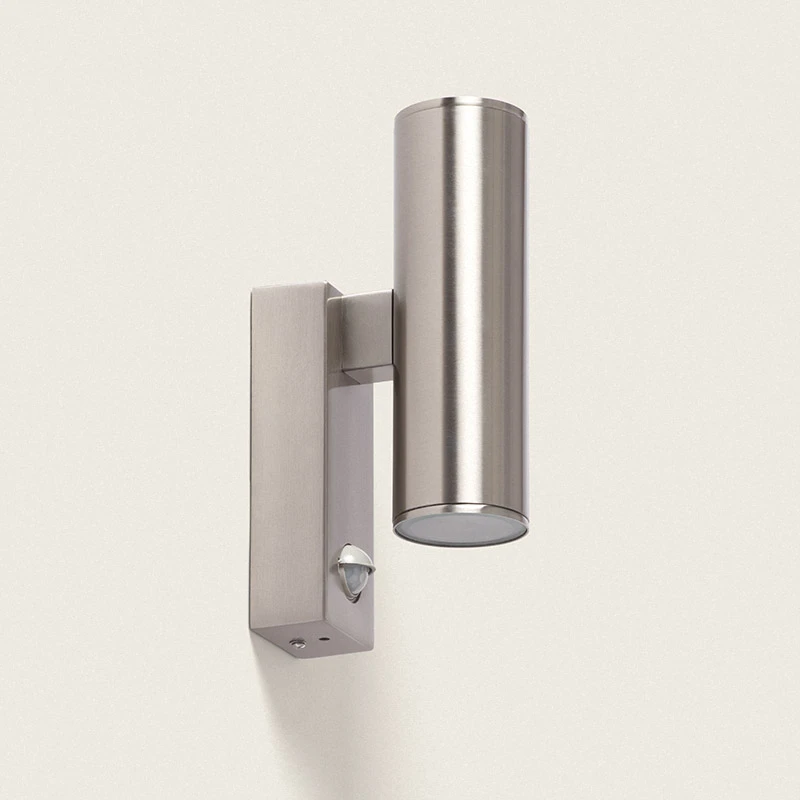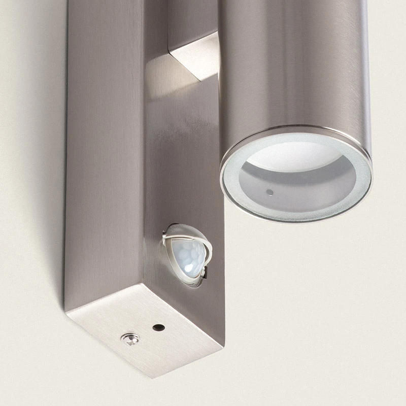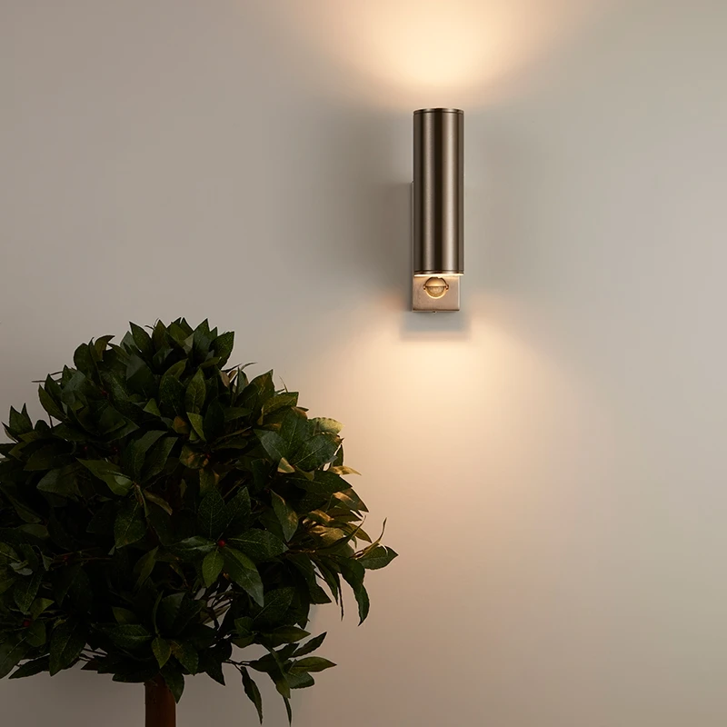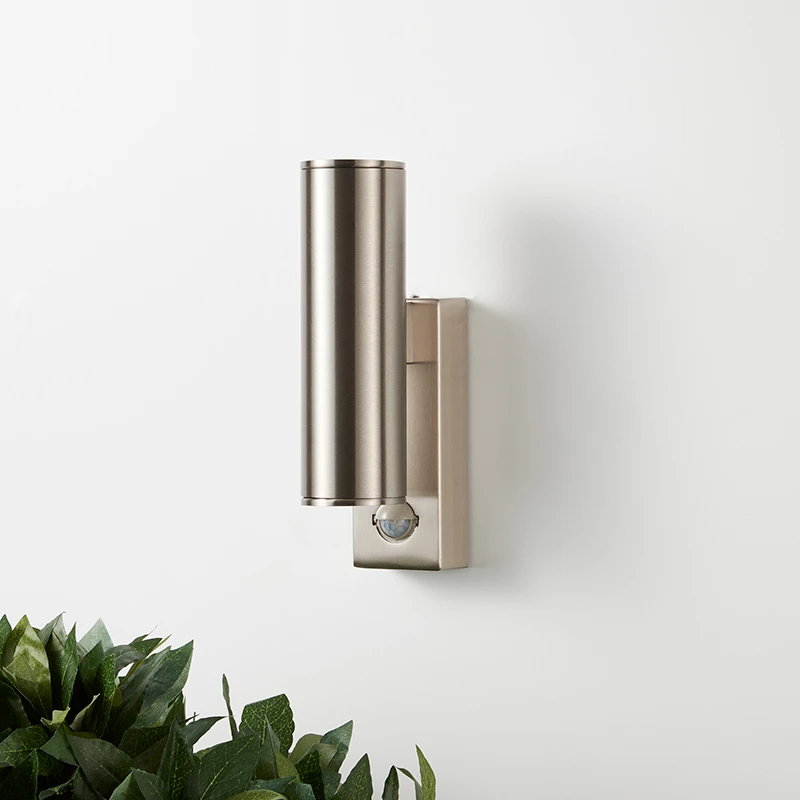 - Outdoor wall light in a stainless steel finish with a PIR moment sensor providing an up & down beam of light through clear glass diffusers