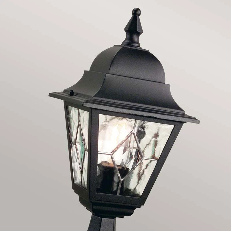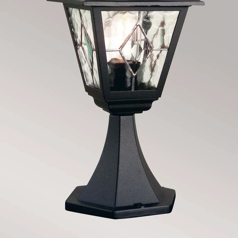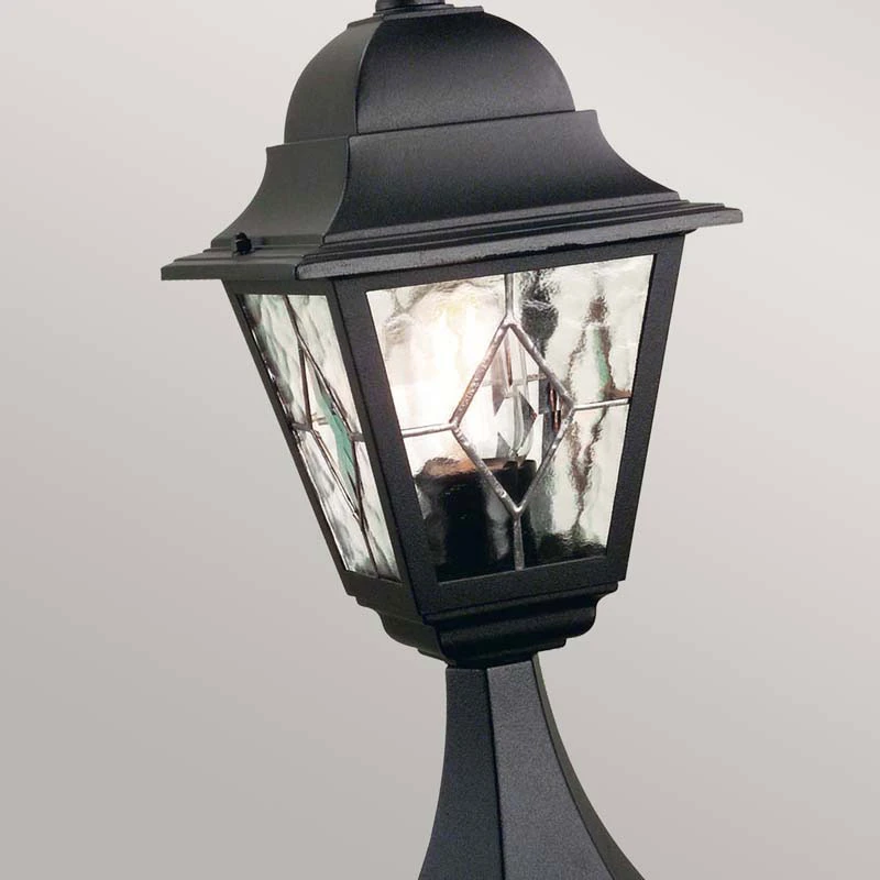 - Die-cast aluminium pedestal lantern in a black finish with hand-leaded glass panes
