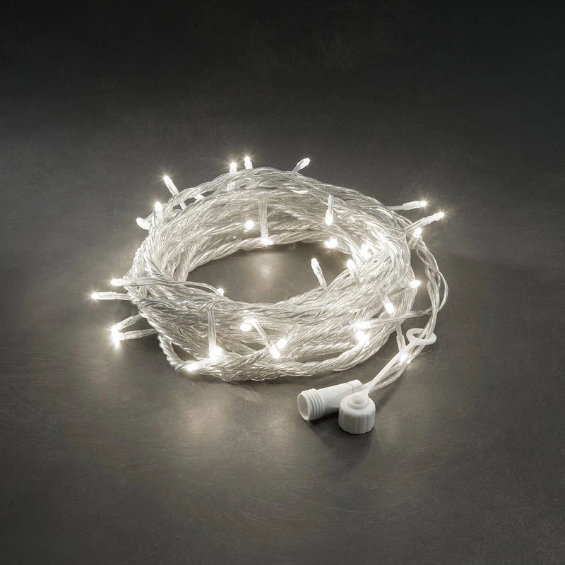 - Connectable string light with 100 warm white LED’s on a clear cable. Designed to be compatible only with other Konstsmide Connectable string lights and accessories