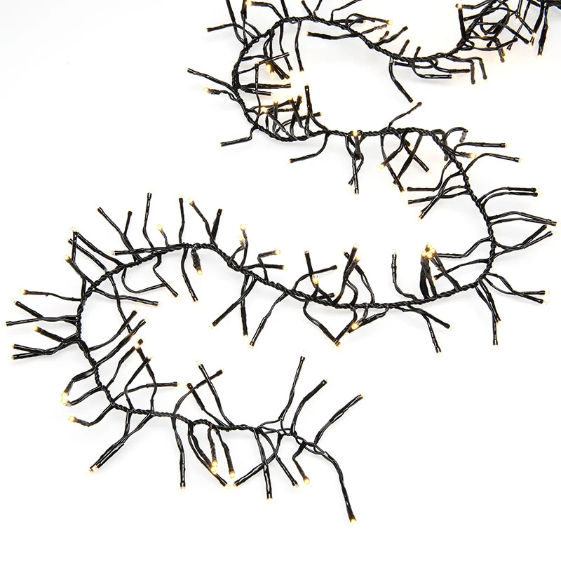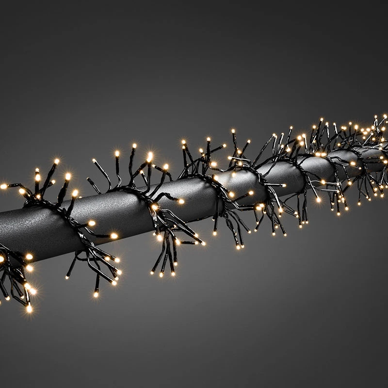 - Cluster string light set with 2016 warm white LED’s on a black cable and multi-function controller with 8 pre-programmed functions: Combination, waves, sequential, slo glo, chasing/flash, slow fade, twinkle/flash and steady on