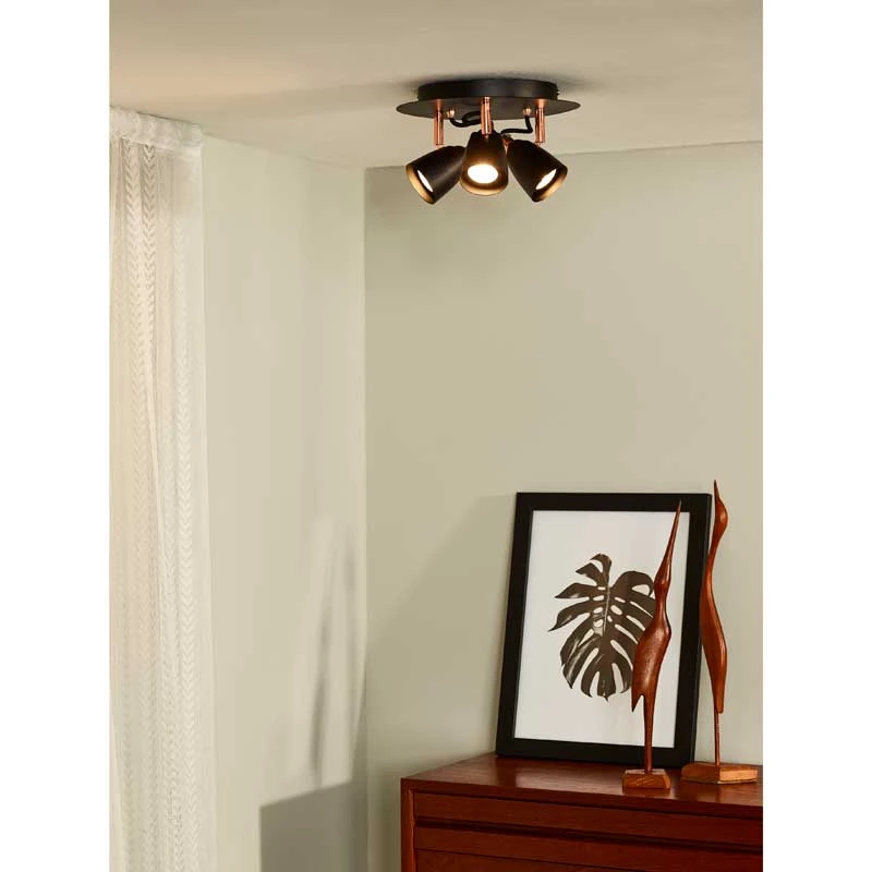 - Metal ceiling spotlight in a matt black finish with red copper detailing