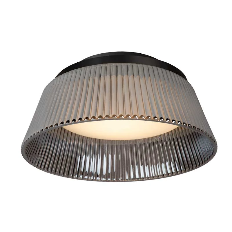 - LED flush ceiling fitting, with a built-in dimmable LED bulb, a smoked grey glass shade with ribbed effect and opal glass diffuser.