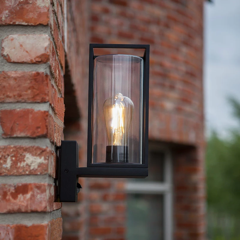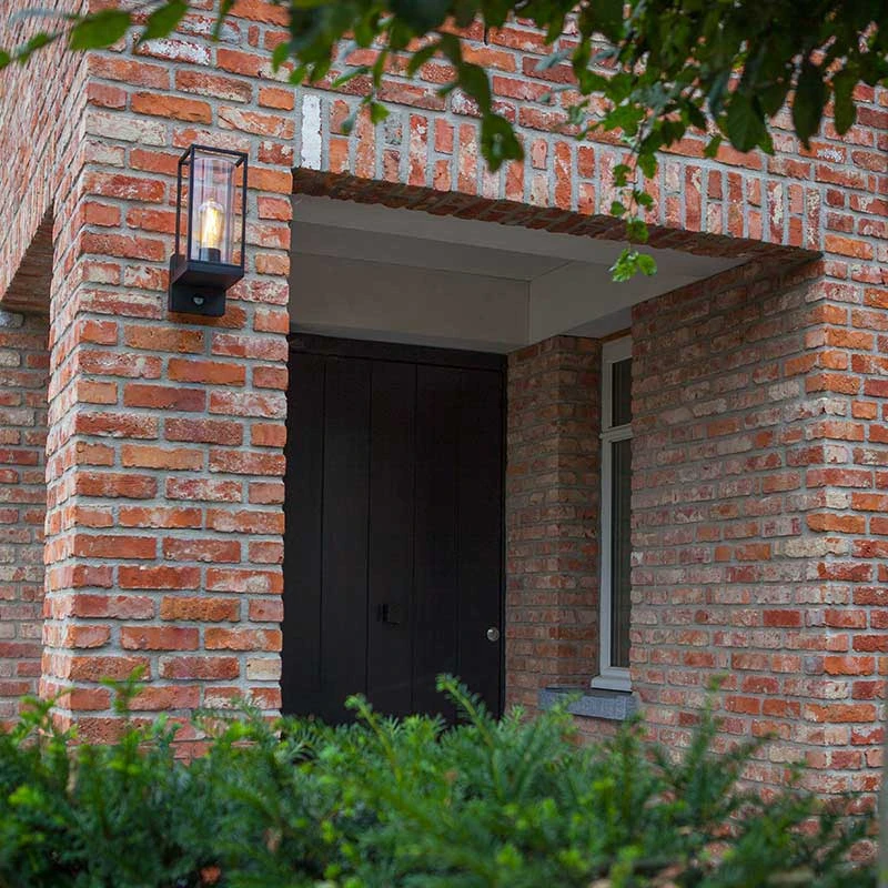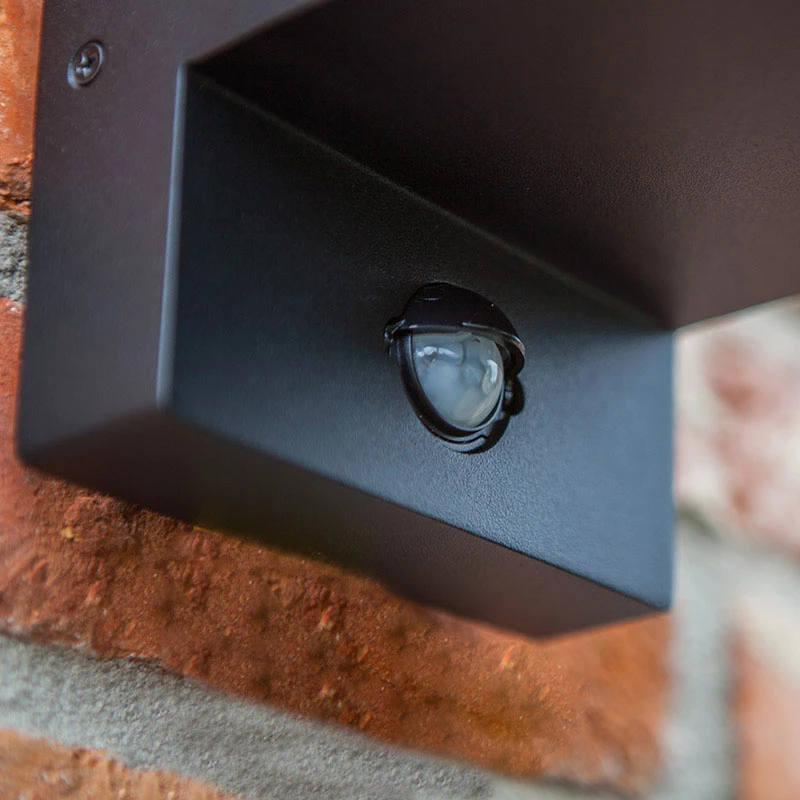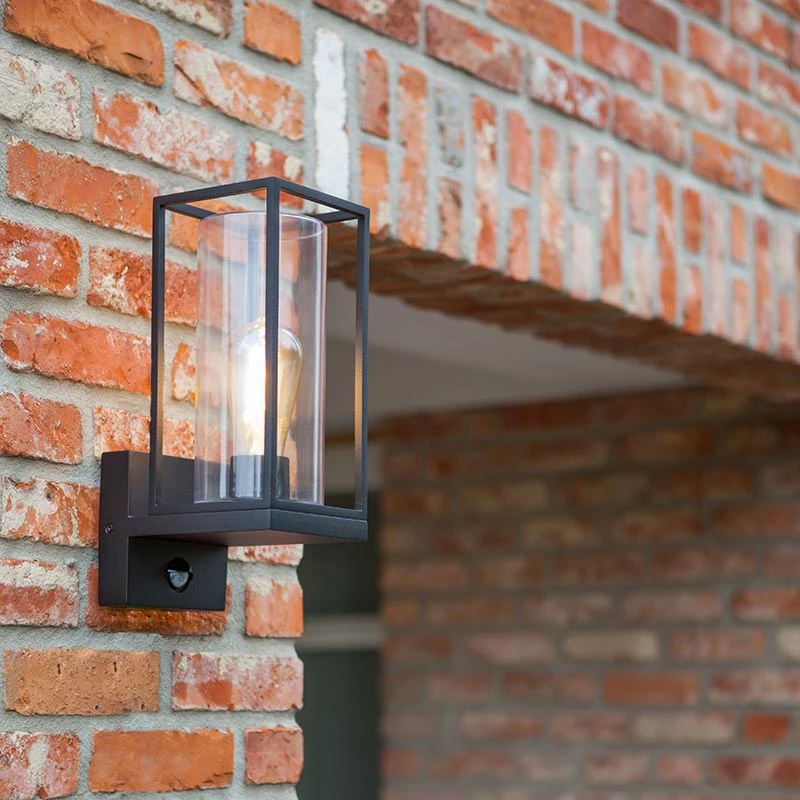- Outdoor aluminium wall lantern in ablack finish with clear glass diffuser and PIR movement sensor