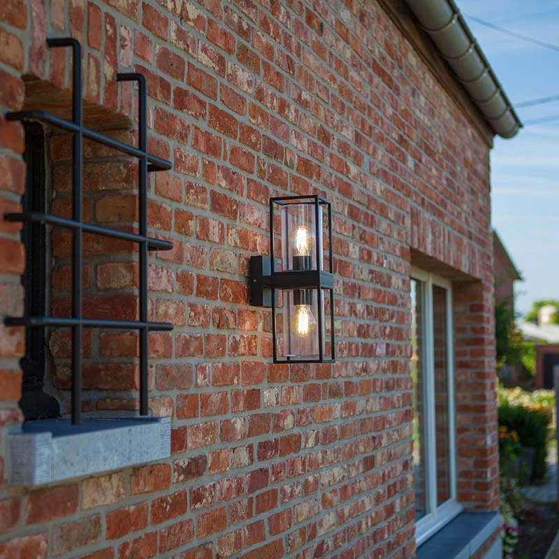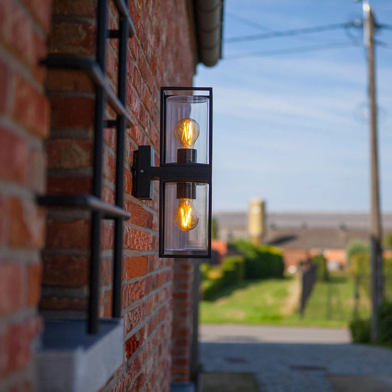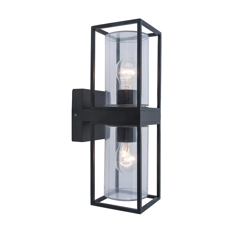 - Outdoor aluminium twin wall light in a matt blackfinish with clear glass panes