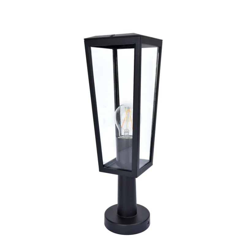 - Die-cast aluminium outdoor pedestal light in a black finish with clear glass panes
