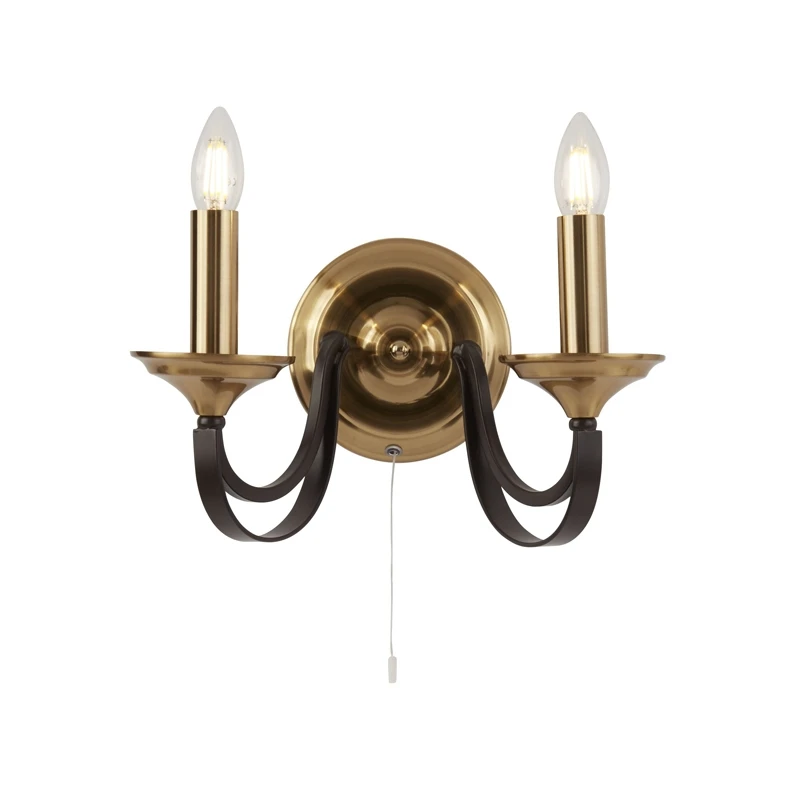 - Traditional twin bracket wall light in a dark bronze and brass finish with on/off pull cord