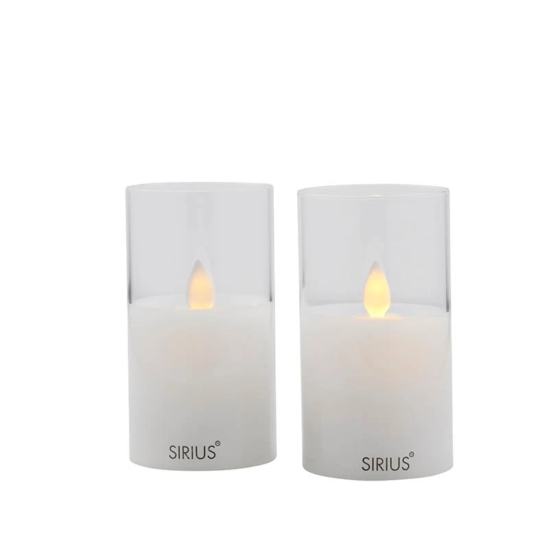 - Set of 2 battery operated mini wax candles with LED flickering flames fixed inside a clear glass hurricane votive